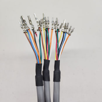 Multi-conductor cable cut, jacket removal, strip, crimp, heat shrink, and label.